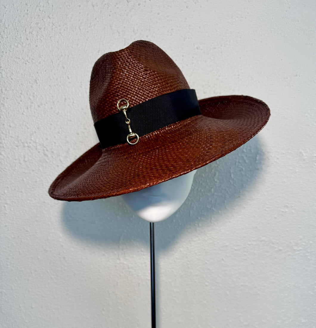 The most beautiful rich oxblood colour Panama fedora. Black grosgrain band and golden horse bit details