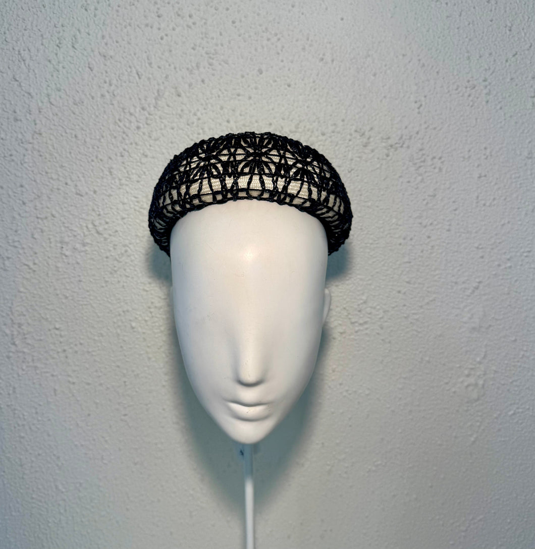 Stunning textural pillbox with vintage woven raffia lace overlay. Ivory rolled details on the rear finish the slick timeless look.