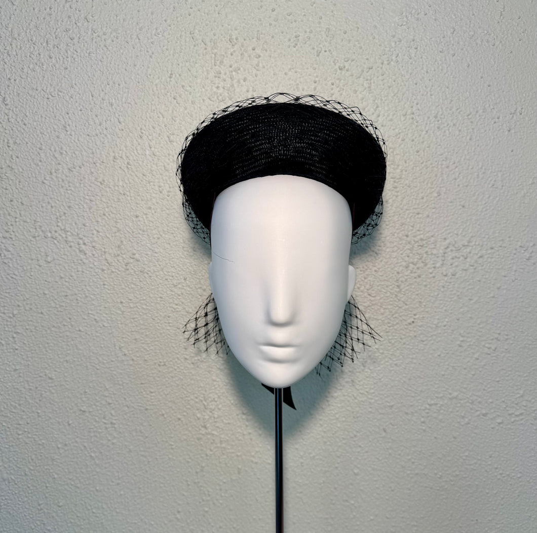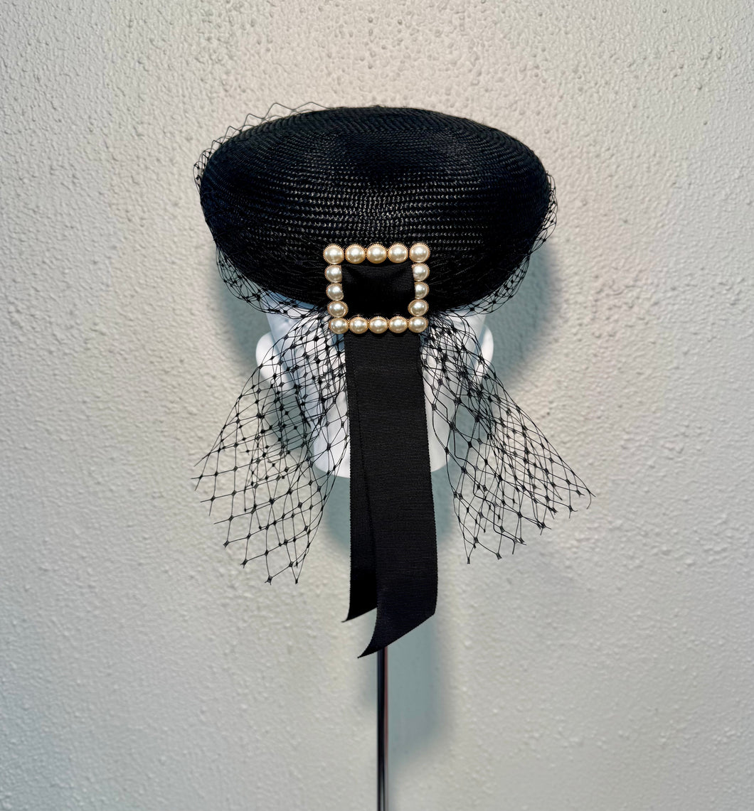 Classic at the front and texture at the back. A piece for the Atelier, black parisisol beret wrapped with veiling that trails at the back through a pearl clasp with a drape of grosgrain.