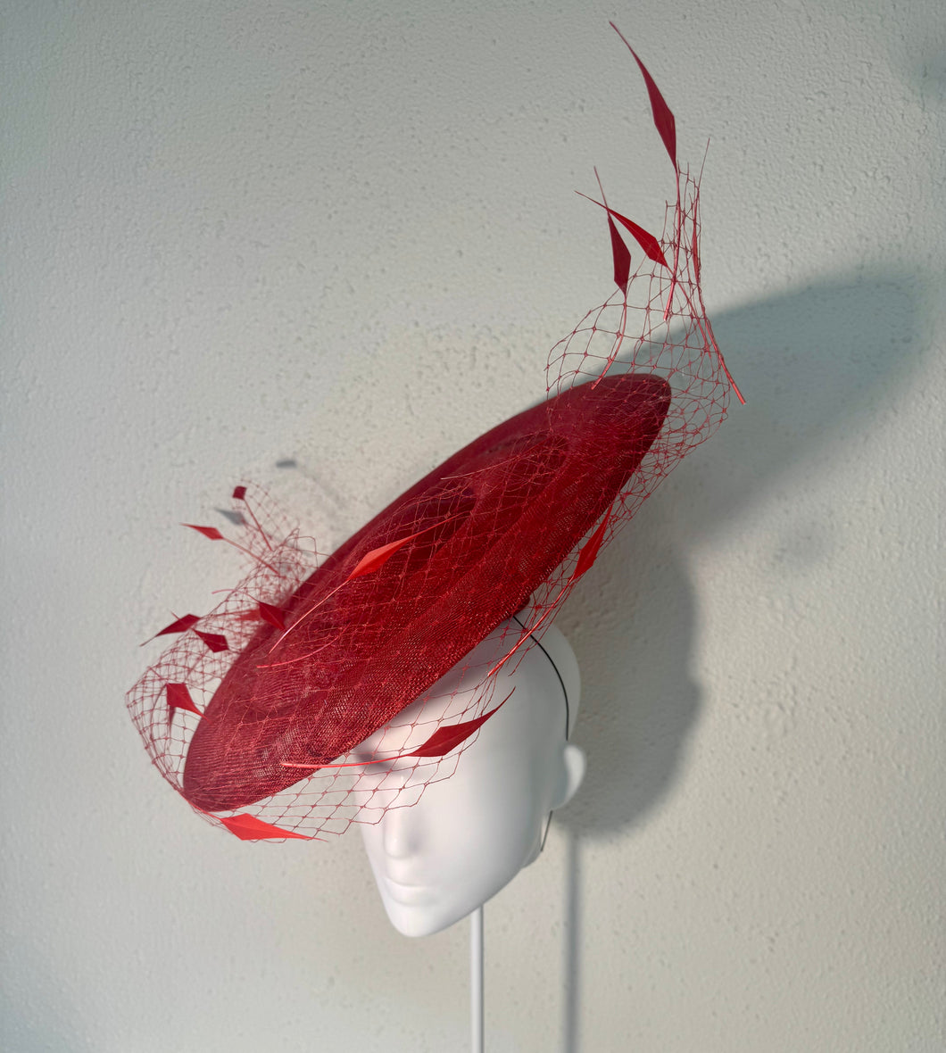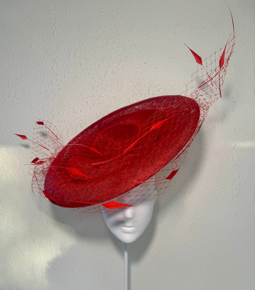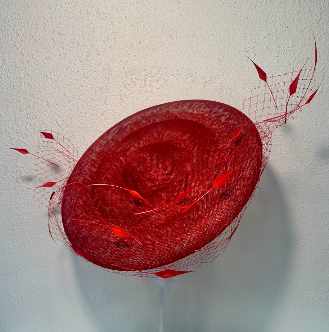 Mumm marquee - so if you are going to the party marquee and want to stand out this piece is for you. A one of a kind red triple satellite hat. A wash of vintage red veiling holds clipped sharp feathers that give hight, texture and drama.
