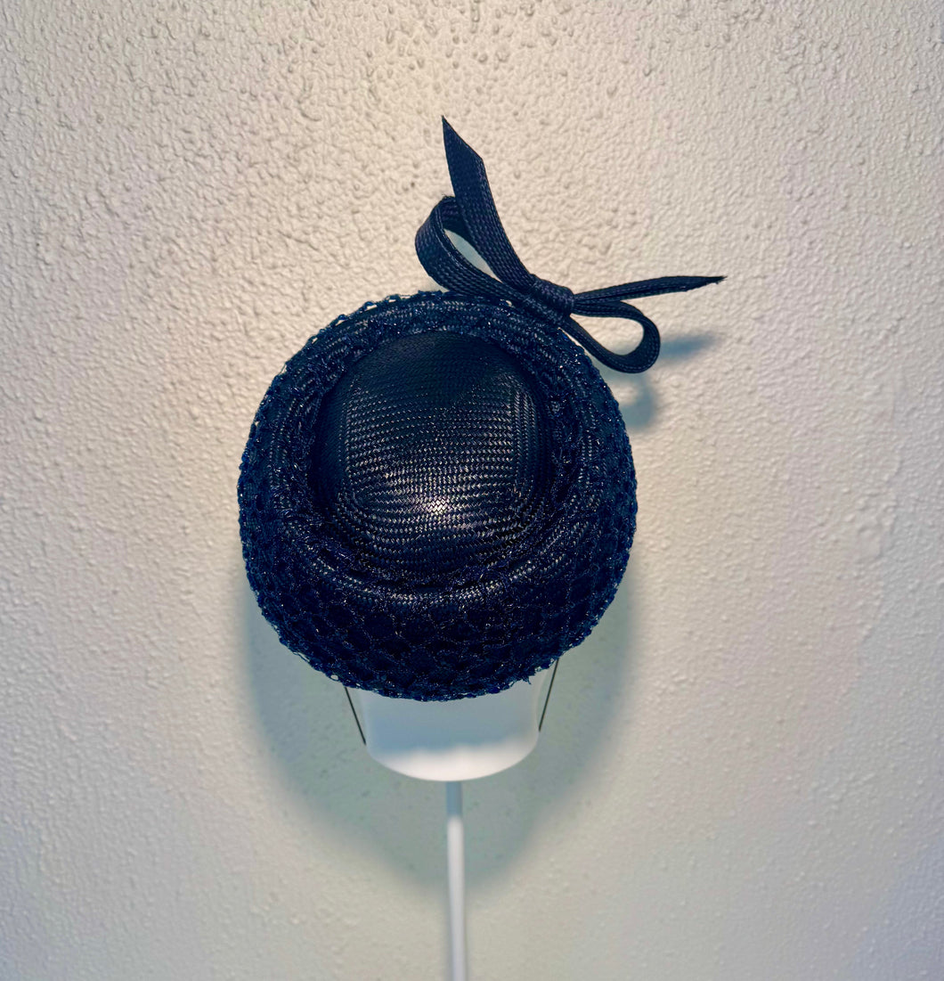 Stunning jeweled navy crinoline has been overlaid and hand stitched onto this French navy pillbox. A simple sharp bow sits to the front. Perfect indoor dining piece